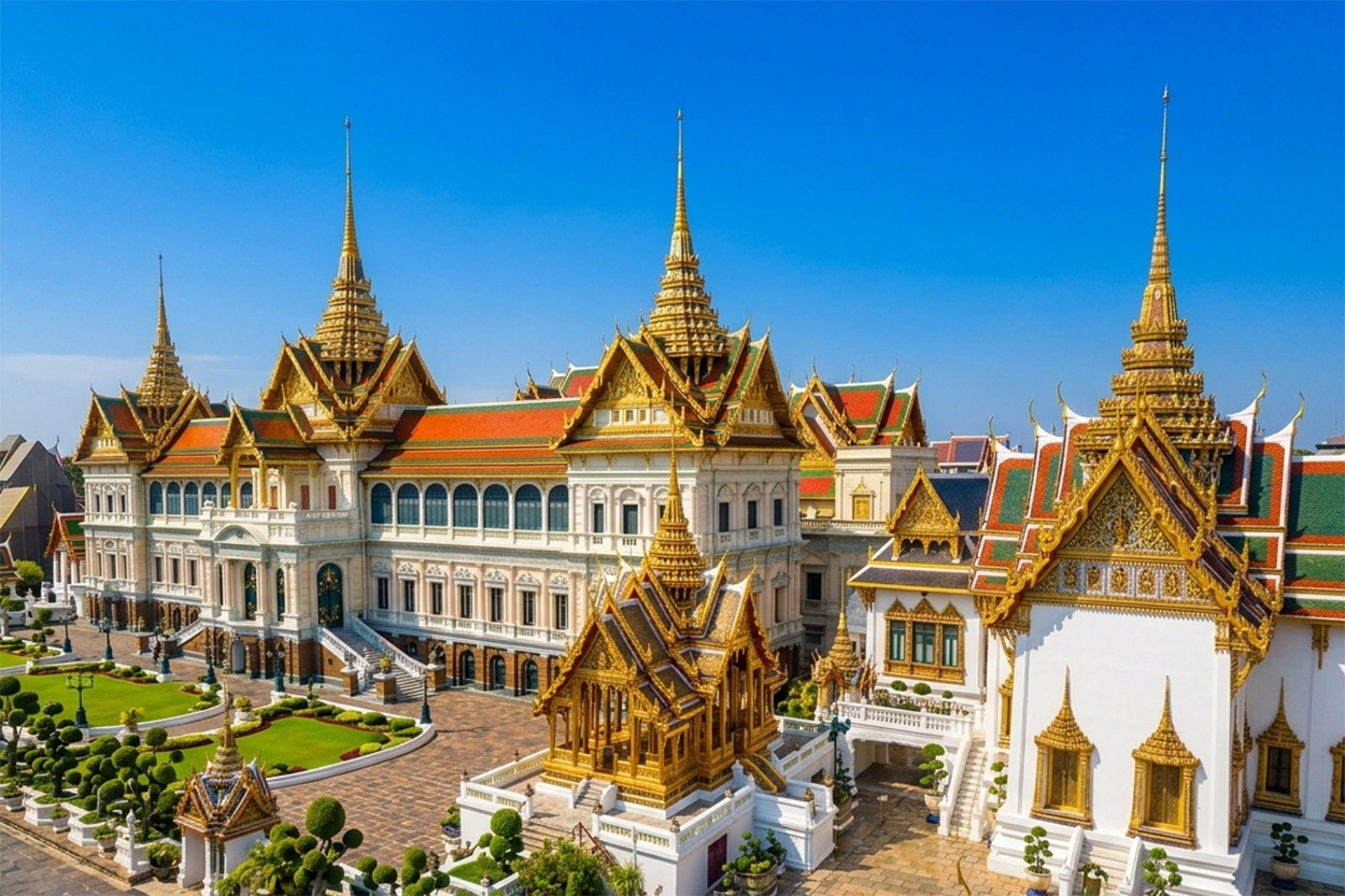 Desayuno y almuerzo. Comenzamos con el Templo Wat Traimit y su imponente Buda de Oro macizo. Luego visitamos el Gran Palacio, joya de la arquitectura tailandesa, y el Templo del Buda Esmeralda. Continuamos al Wat Pho, con su Buda Reclinado de 46 metros y su historia como cuna del masaje tradicional tailandés. Regreso al hotel. Alojamiento.
